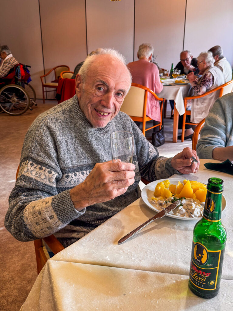 Dass beim Heringsessen nicht nur der Geschmack, sondern auch der Service stimmte, zeigt eine kleine Szene im Speisesaal. Für Günter bereitete die Küche den Heringsalat extra ohne Joghurt zu.